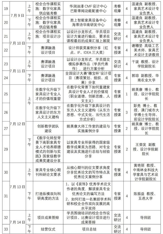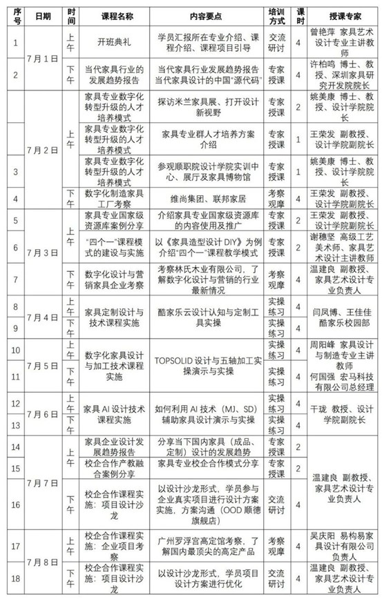 培训对象:面向高等职业院校家具设计、家具工艺、产品设计、环境艺术设计等相关专业的教研室主任、专业负责人、专业带头人、骨干教师等。