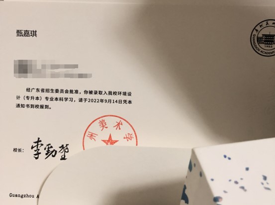 2022年专升本以417分总成绩第四名的优异成绩考上了公办本科广州美术学院环境艺术设计专业。