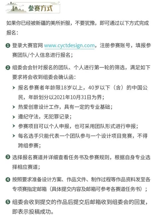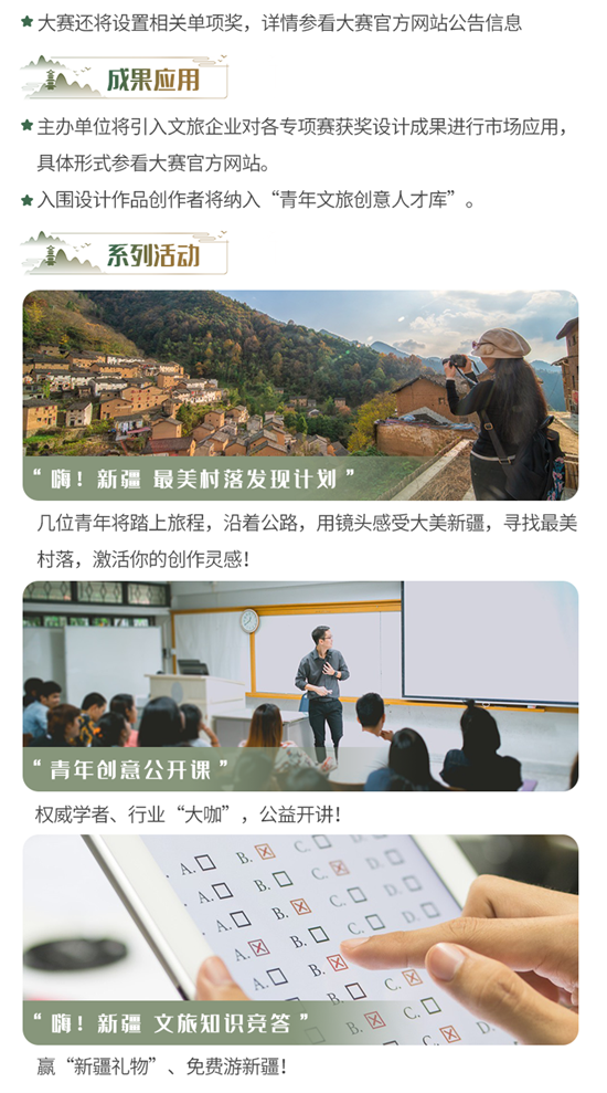 创青春·中国青年文化旅游创意设计大赛(文化润疆专项)由共青团中央青年发展部、文化和旅游部产业发展司、新疆维吾尔自治区文化和旅游厅、中国光大集团文旅事业部共同主办,从即日起面向全国高校学生和青年设计人才全面展开。