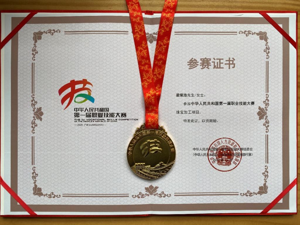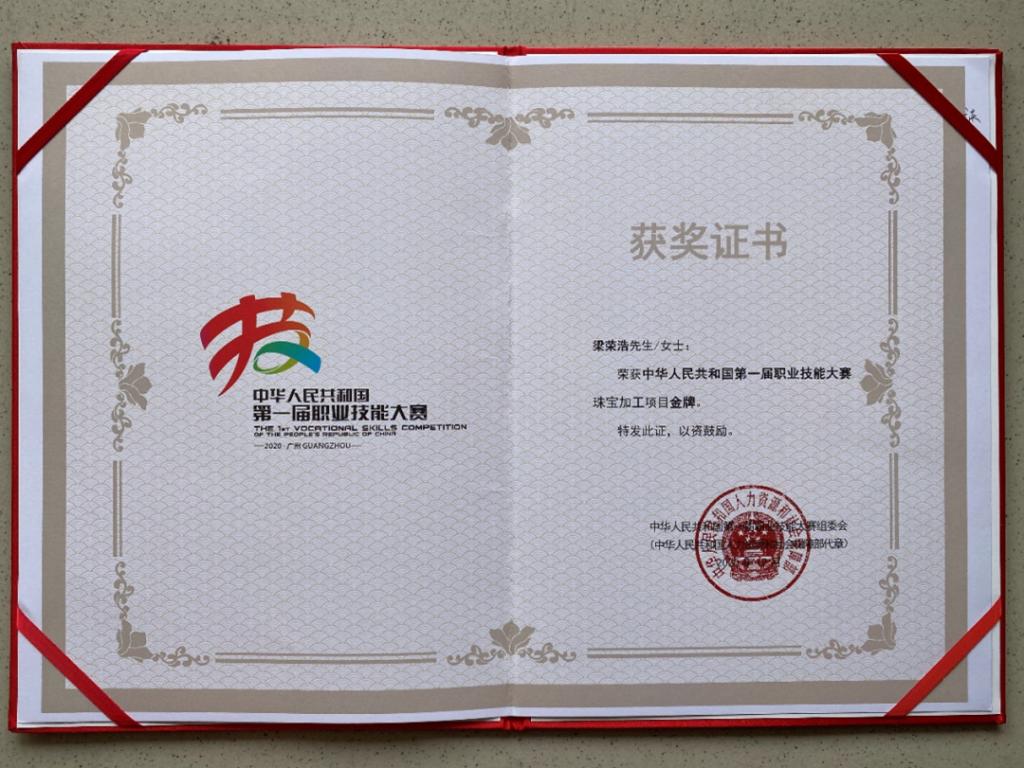 2020年12月13日晚,第一届全国技能大赛闭幕式,当主持人高声宣布获得广东代表队梁荣浩获珠宝加工项目金牌。