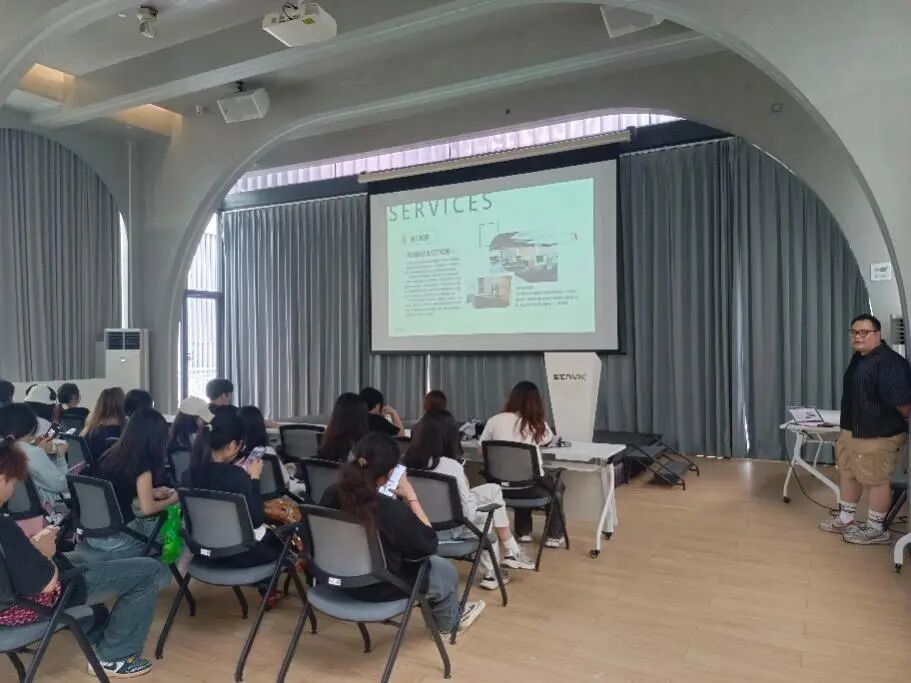 在座谈环节,卢经理分享了产业园区的核心策略:以“人本化、生态化、智慧化”为核心的规划设计理念,平衡效率与体验;精准定位文化创意、科技研发类企业的招商运营模式,提供全周期增值服务;通过社群活动、资源对接会激活园区生态的创新实践案例。学生们围绕办公空间趋势、可持续设计等话题踊跃提问,企业团队逐一解答,现场互动热烈。