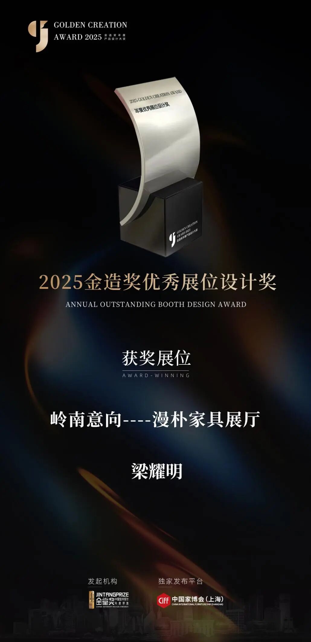 近日,在第 56 届中国 (上海) 国际家具博览会(CIFF 上海)上,设计学院教师梁耀明为佛山市漫朴家具有限公司设计的《岭南意向 —— 漫朴家具展厅》,经柳贯中教授领衔的国内外专业评委严苛评审与层层选拔,从全球 1500 余个品牌展位中突围、脱颖而出,跻身仅有的 9 个最终获奖展位作品之列,成功斩获 2025 年度金造奖 “年度优秀展位设计奖”。
