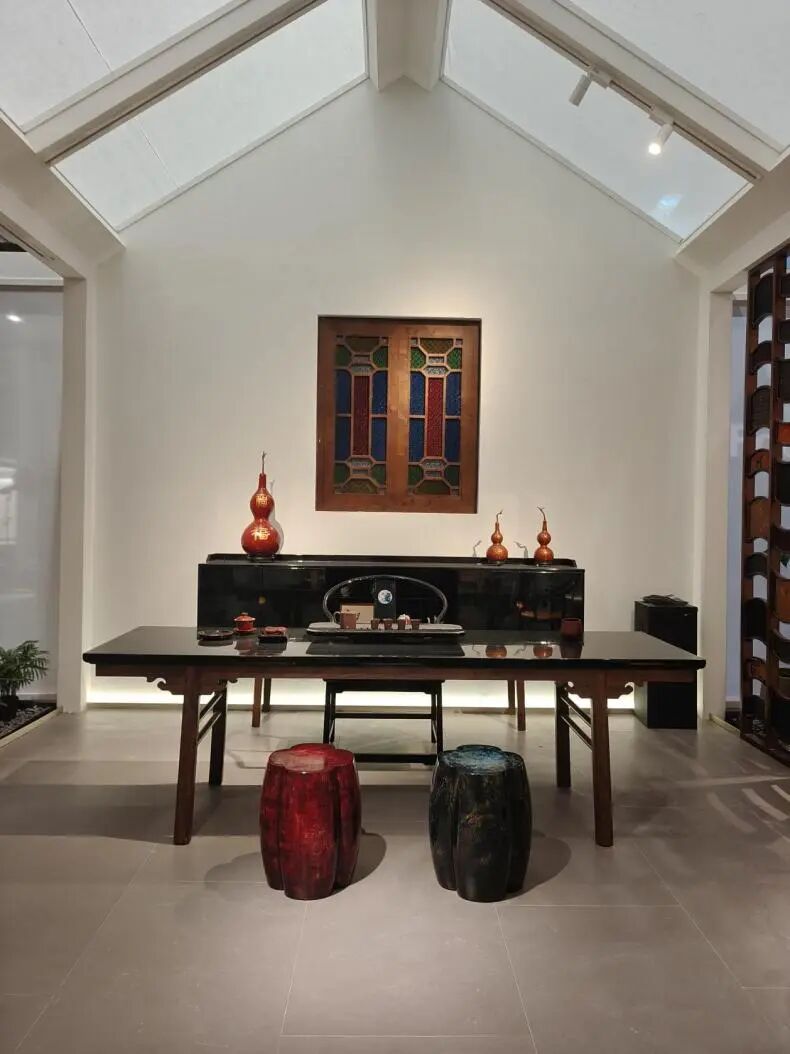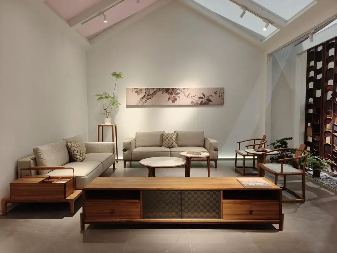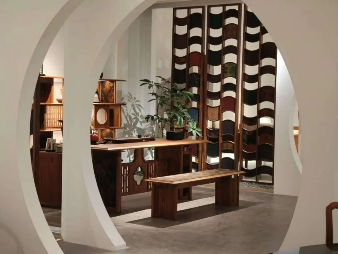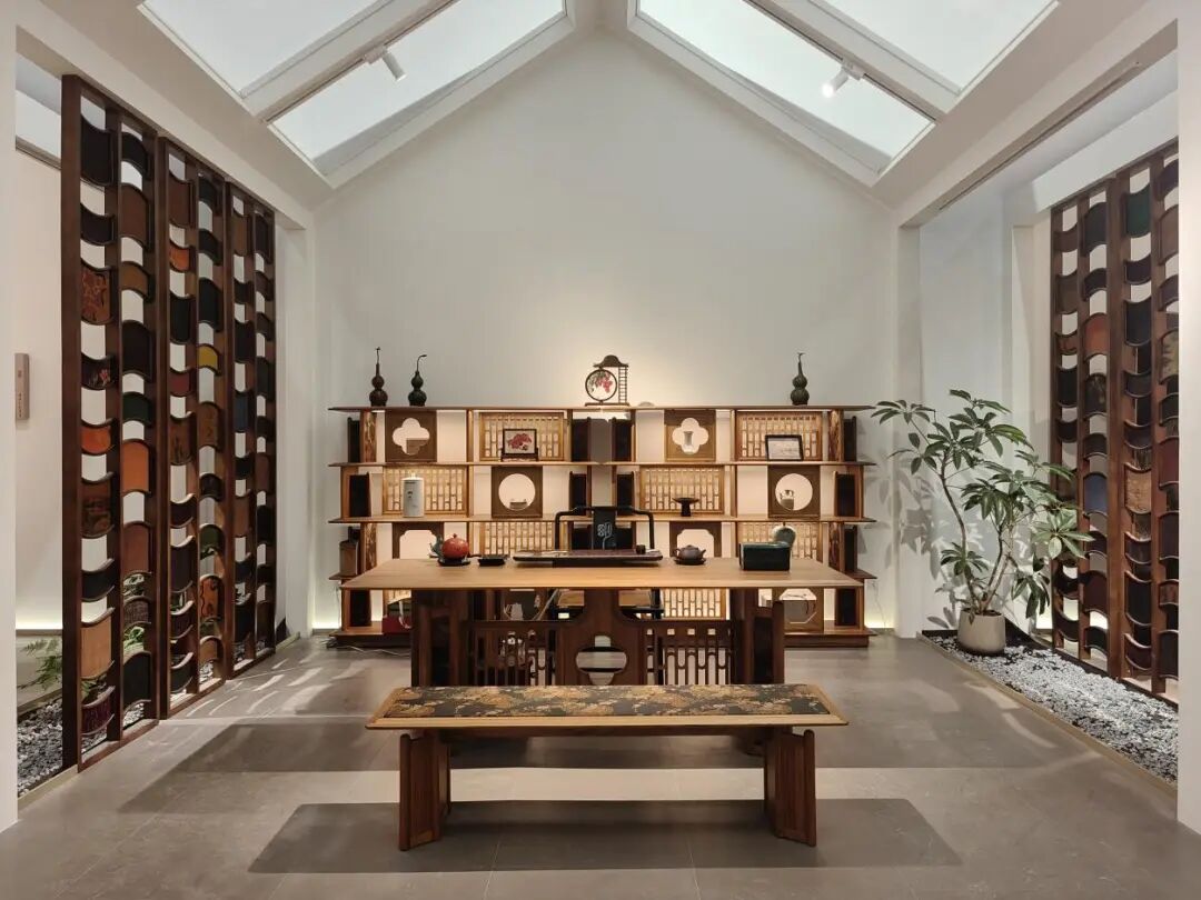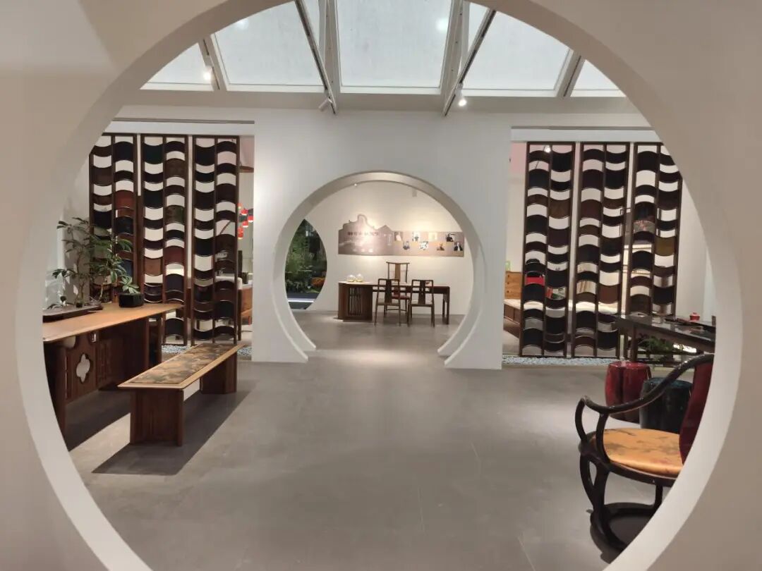 空间布局上,作品充分利用场地 16:9 长宽比,创新性借鉴岭南传统 “三进” 大宅民居特点,以三个现代简约的 “人字山墙” 构建前厅、中堂、后堂及双天井庭院,既延续传统建筑空间精髓,又通过双天井增强空间独立性与层次感,让每一套家具都能在专属场景中极佳呈现,实现传统布局与现代展厅功能的创新融合。
