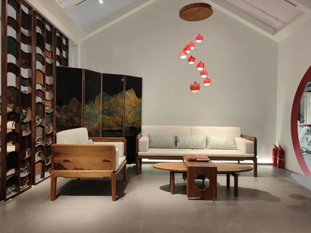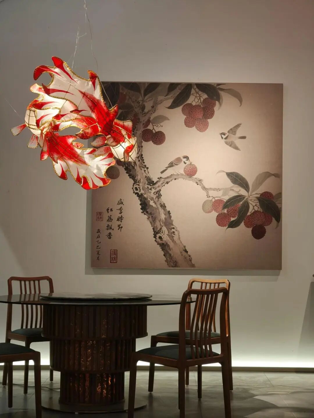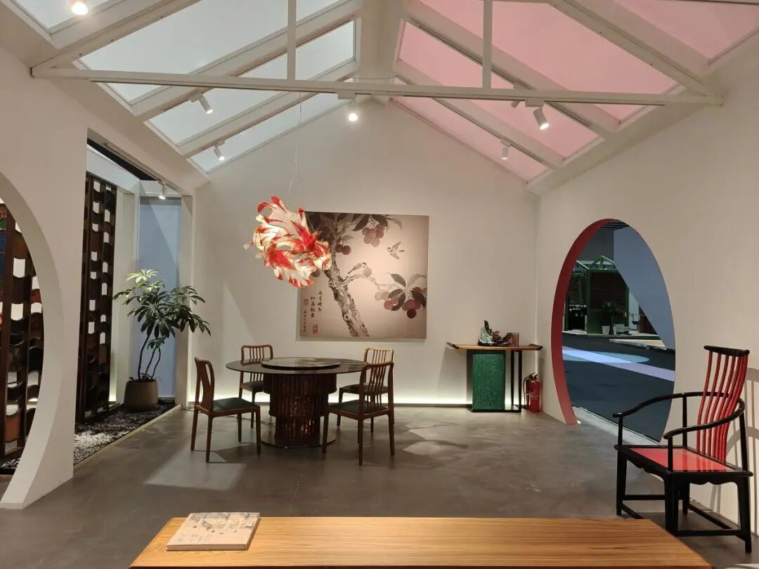 同时,展厅还深度融合岭南非遗文化与现代设计语言:引入大良鱼灯、香云纱屏风、大漆等非遗元素,搭配 “人字山墙” 现代造型,借满洲窗等传统构件,加上运用AI技术创作荔枝主题国画与现代空间的碰撞营造岭南意象;更运用岭南园林对景、框景、借景手法,让观众在游走中 “移步换景”,将餐厅、客厅、茶室等现代家居场景巧妙融入传统空间,达成传统与现代的完美结合。