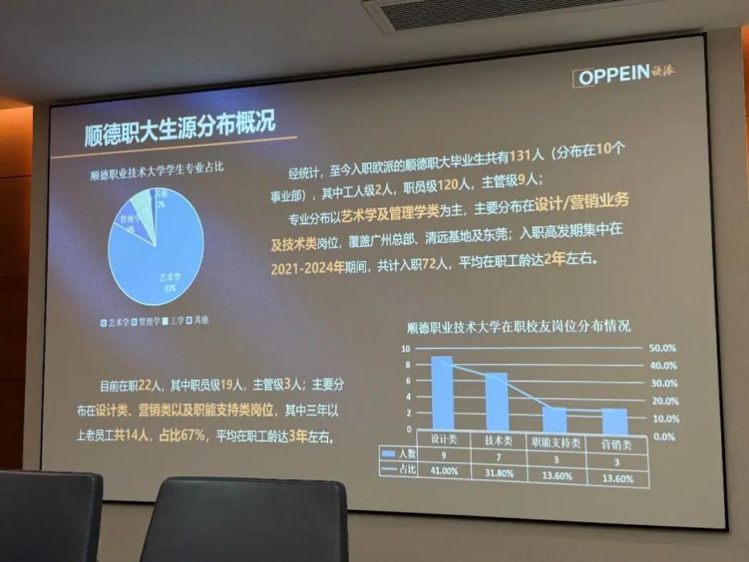 欧派人事部现场展示的《顺德职大生源分布概况》显示,我校累计131名毕业生入职欧派,覆盖集团10个事业部,其中2人任工人级岗位,120人任职员级岗位,9人已晋升主管级。目前在职的22名校友中,设计类岗位占比最高,67%员工工龄超3年,平均工龄约3年。数据充分印证了顺职大学子扎实的专业技能、快速的岗位适应力及企业忠诚度,形成“顺职大品牌”的良好口碑。