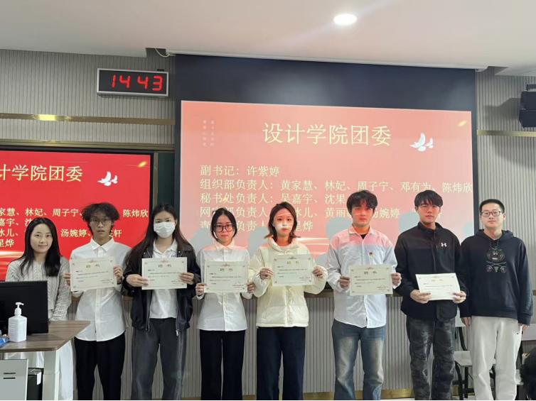 会议上,指导老师郝洪涛、王璨为设计学院团委第二十三届委员颁发聘书,肯定他们在任期内的辛勤付出与突出贡献,表示是他们以责任与担当为学院团委建设奠定坚实基础。