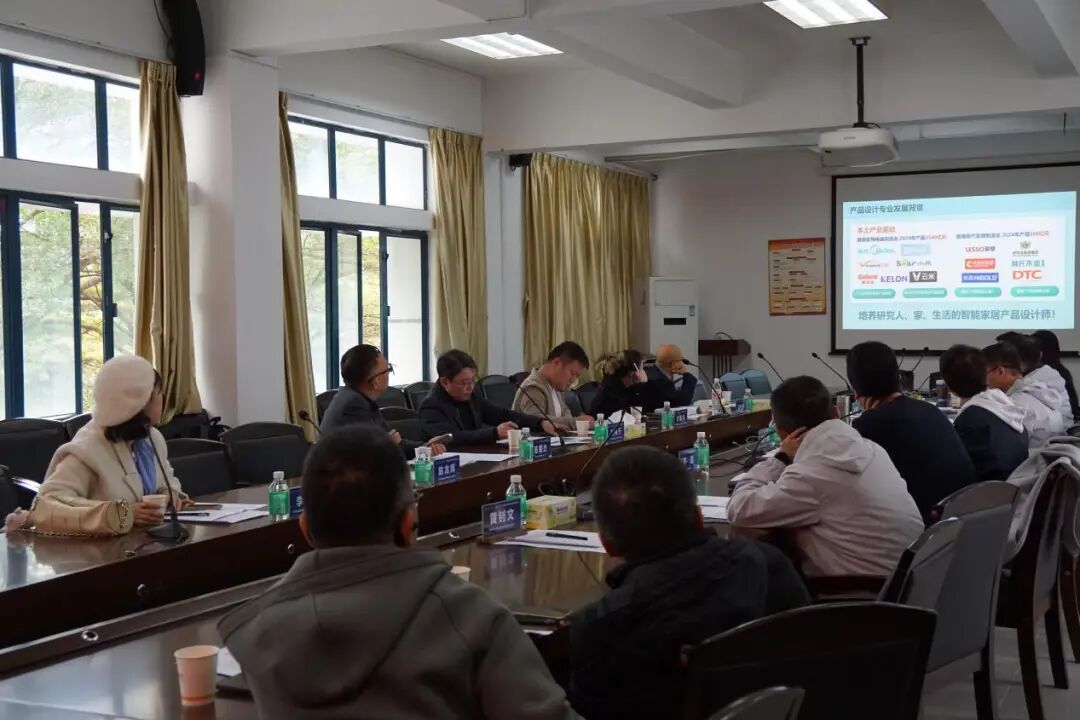 美的集团家用空调事业部工业设计中心国内产品设计负责人叶家兵、广东新宝电器股份有限公司品牌总监陈龙辉、小熊电器股份有限公司技术总监邓财科、欧派家居集团广东事业部设计培训负责人吴新梦、广东林氏家居股份有限公司产品经理李婉莹、广州美术学院湾区创新学院副院长刘再行、广东工业大学艺术与设计学院工业设计系主任陈朝杰,以及我校教务处代表黄钊文老师、设计学院领导班子、产品设计专业全体教师参加会议。
