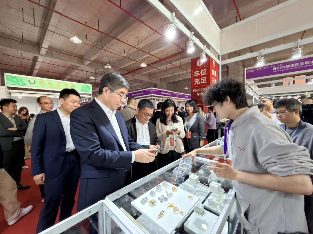 展会期间,佛山市委常委、常务副市长刘杰,中国珠宝玉石首饰行业协会会长叶志斌等多位重要嘉宾专程莅临展位参观指导。我院党总支书记甘子超、专业负责人黄嘉琳现场汇报了学院专业发展规划、人才培养模式及本次参展情况,生动展示了学生的创新设计成果。