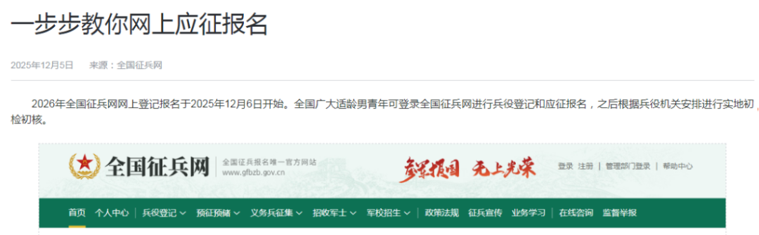 2026年全国征兵网网上登记报名已正式开启!依法履行兵役登记是适龄大学生的法定义务,而参军入伍更是青春最有价值的选择——在这里既能褪去稚气、淬炼筋骨,收获成长与担当,践行保家卫国的誓言,还可享受升学加分、考研专项、就业推荐等专属优待,无论是否有参军意愿,这份贴合本校学子的征兵全攻略都务必收藏,其中涵盖报名流程、关键节点等核心信息,别让犹豫留下青春遗憾,趁年少赴军旅,让青春在守护家国的征程中绽放光芒!