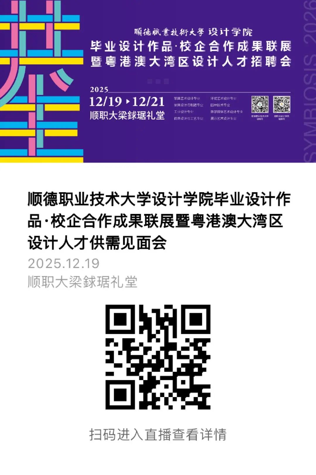 12月19日,以“共生”为主题的2026届顺德职业技术大学设计学院毕业设计作品·校企合作成果联展暨粤港澳大湾区设计人才招聘会开幕。本次活动汇聚了8个专业、近900名毕业生的优秀毕业设计作品,同步举办的粤港澳大湾区设计人才招聘会吸引了118家企业现场招聘、数百家企业线上“云招聘”,线上线下观展的师生及行业、企业代表突破10万+,共同构建了设计与产业、传统与创新、学校与社会的"共生"生态。